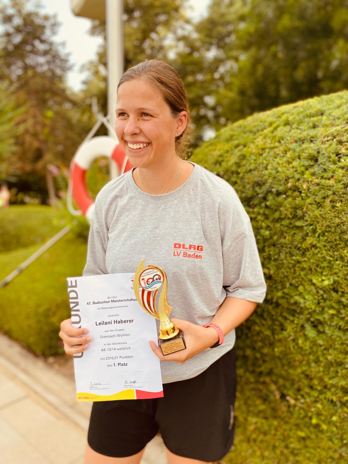 Erstmals seit 1998 hat die DLRG Ortsgruppe Grenzach-Wyhlen wieder eine Schwimmerin, die zu den Deutschen Mehrkampf-Meisterschaften nach Hannover fährt. Durch Ihren Sieg in der Altersklasse 13/14 bei den diesjährigen Landesmeisterschaften des Landesverbands Baden durfte Leilani am Kadertraining teilnehmen. Aufgrund ihrer hervorragenden Leistungen ist sie außerdem für den Bodenseepokal am 27.7.25 in Stuttgart nominiert!