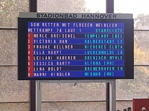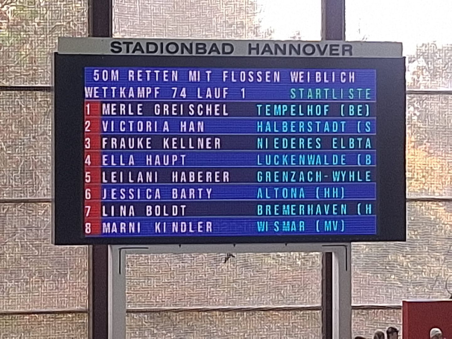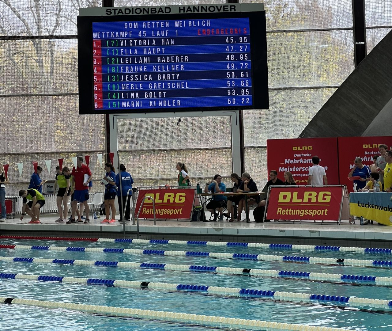Unsere Schwimmerin Leilani hatte sich mit ihrem ersten Platz bei den Landesmeisterschaften die Teilnahme an den 52. Deutschen Mehrkampf Meisterschaften im Rettungsschwimmen (DMM) gesichert. Diese fanden vom 23. - 25. Oktober 2025 zum wiederholten Male in Hannover statt.